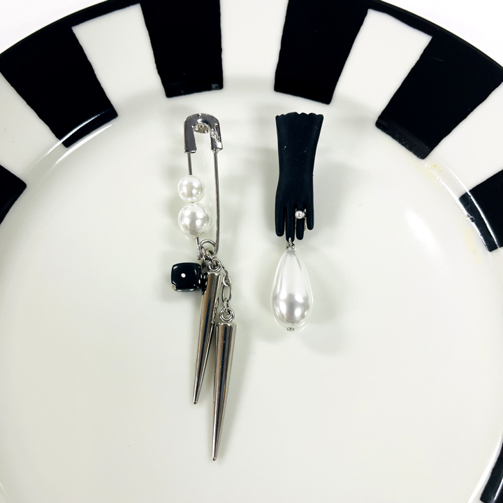 パールのリングをつけたBLACKグローブ ドロップパールが煌きます パンク気分を上げる揺れるスタッズ&ピン クラシカルなパールも気分です。