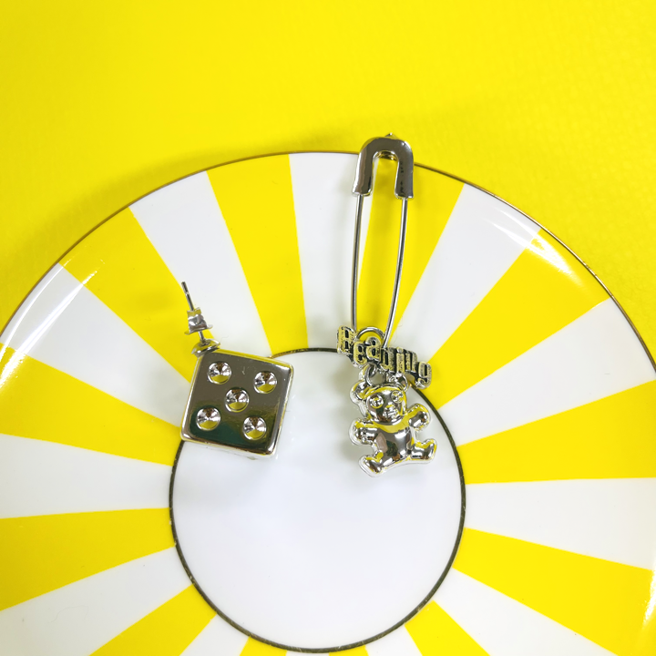立体的なシルバーダイス 浮いているように耳元で輝きます。パンク気分のピンには