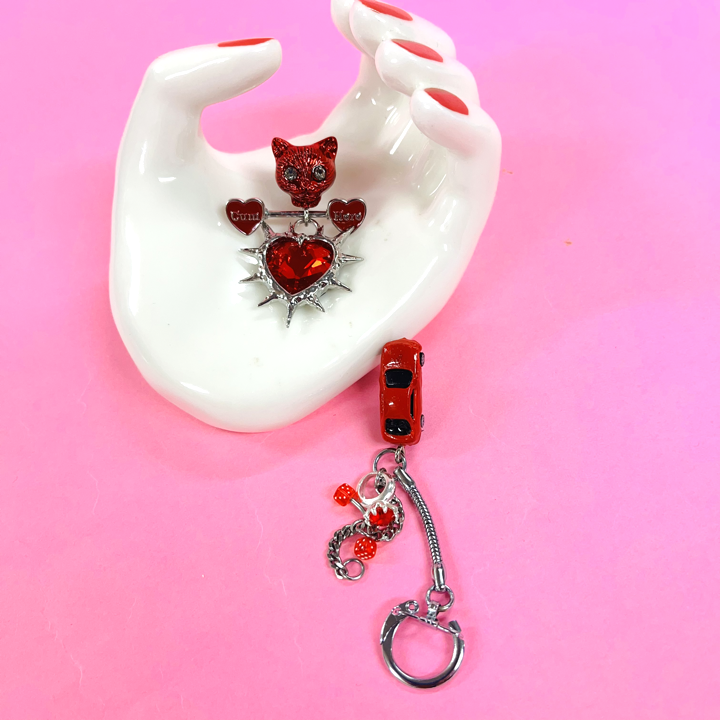 REDメタリックに輝くCATにはPUNK気分のハートビジューとボディピアスが輝きます。