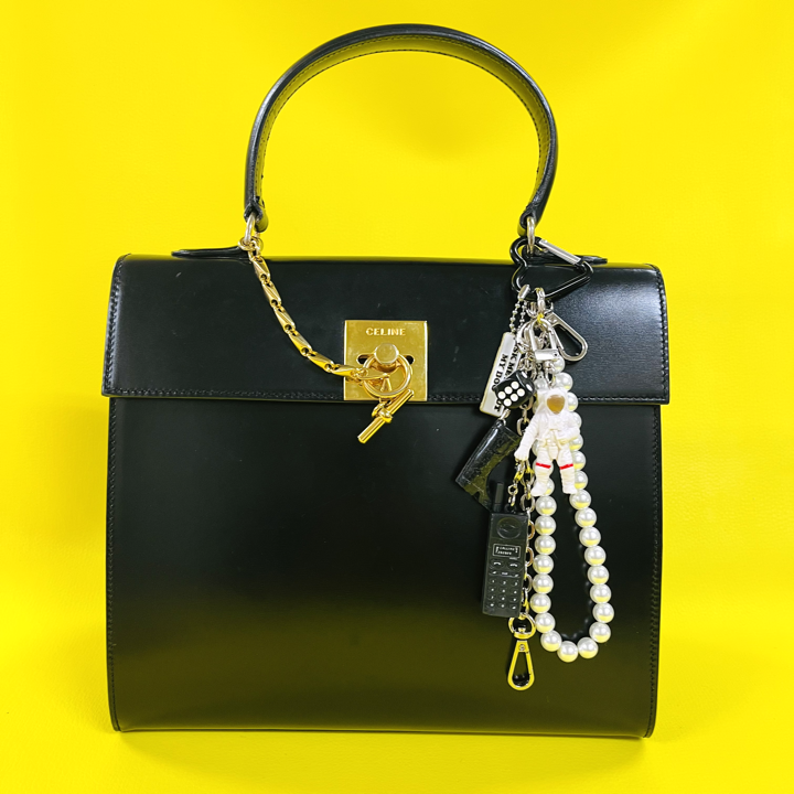 ハートカラビナとチェーンが甘さの中にエッジを効かせています。