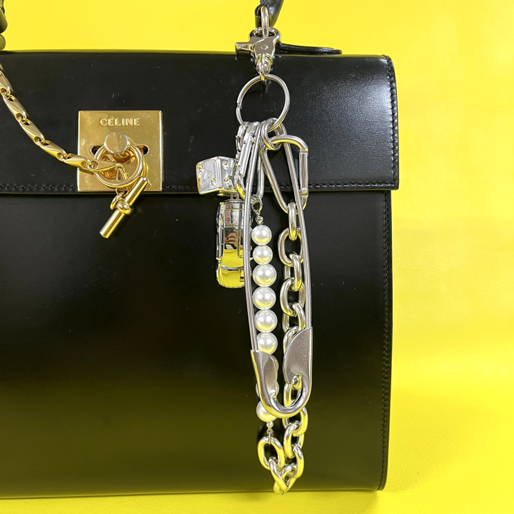 印象的なSILVERカラーのBIGピン 運を決めるダイス 輝く車 揺れるパール&チェーン ユーモアがいっぱいです。