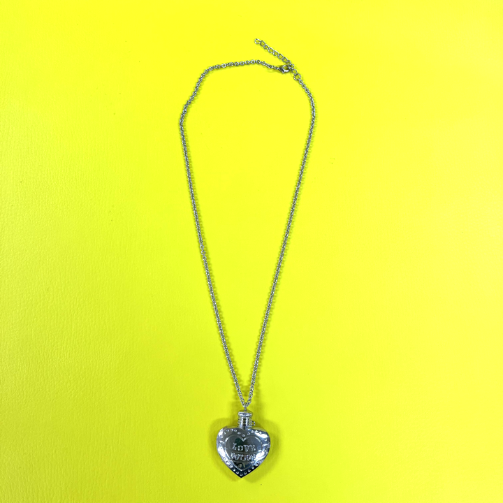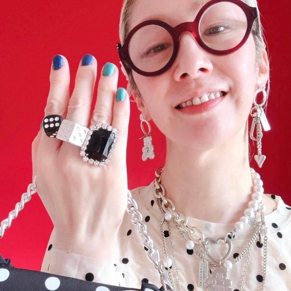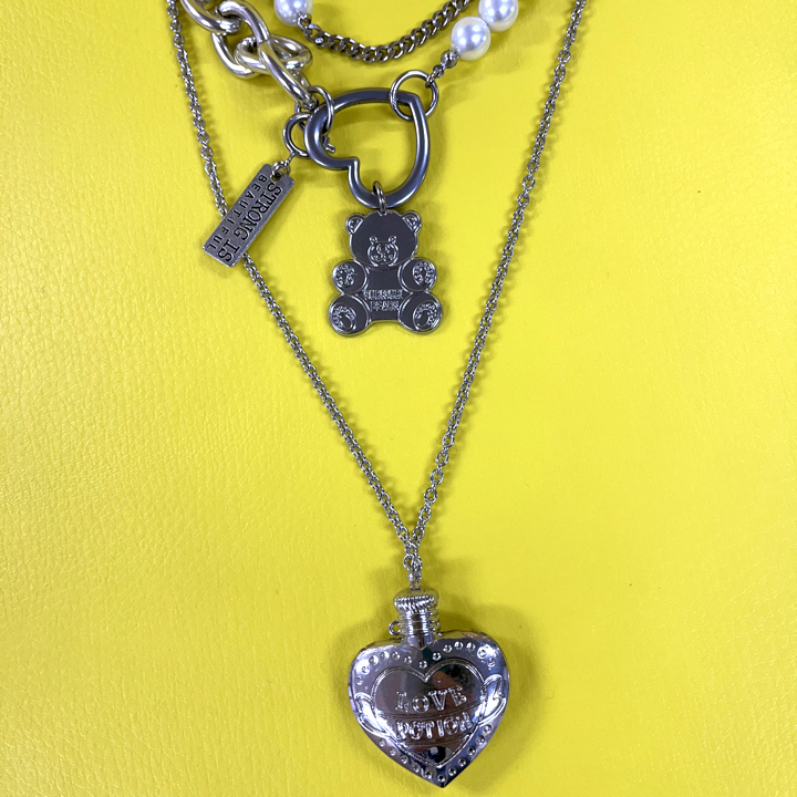 カラビナが効いたチェーンにはguriguriベアとハートが! ロングパールネックレスは巻きつけてチョーカー使いも 媚薬ハートも揺れています。