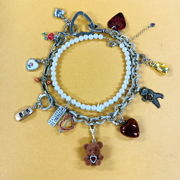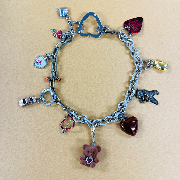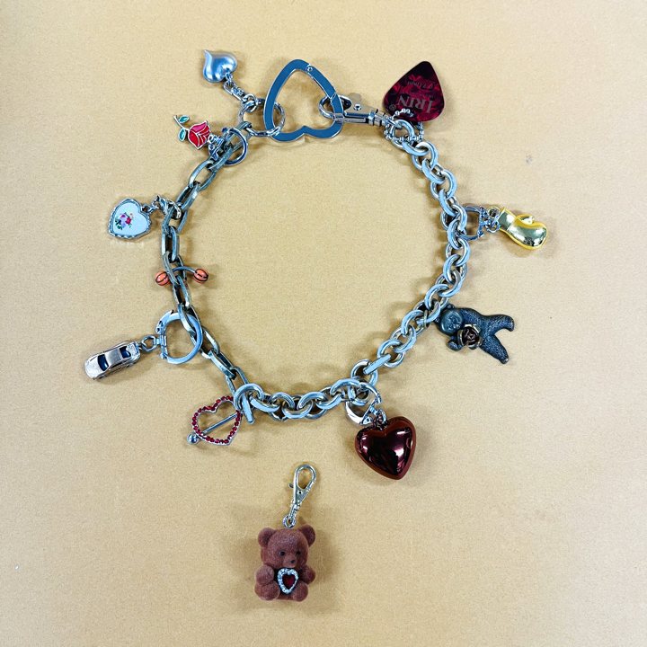 ハートビジューをつけたクマ ゴールドスポーツカー ボクシンググローブ ハートボディピアス ローズを抱くクマ バラを抱いたクマ ギターピックなどユーモアがいっぱいのチャームが輝きます。