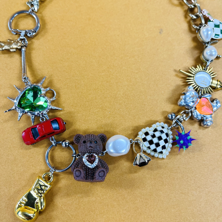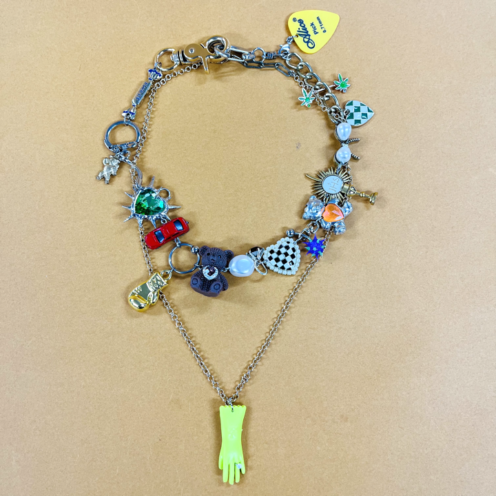 お気に入りのおもちゃにユーモア溢れるスパイス&ビジューを散りばめたネックレスです
