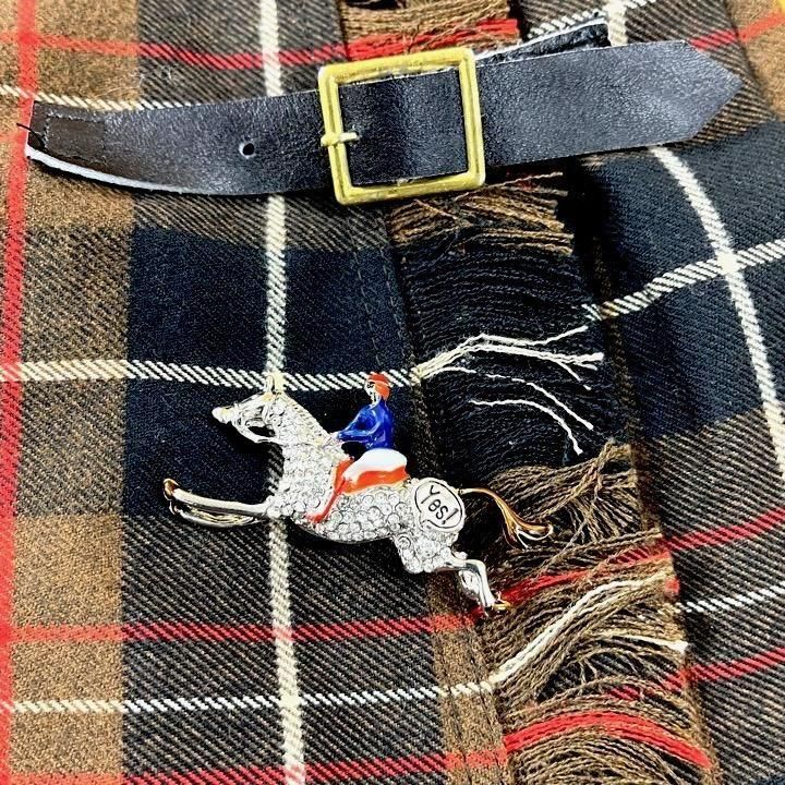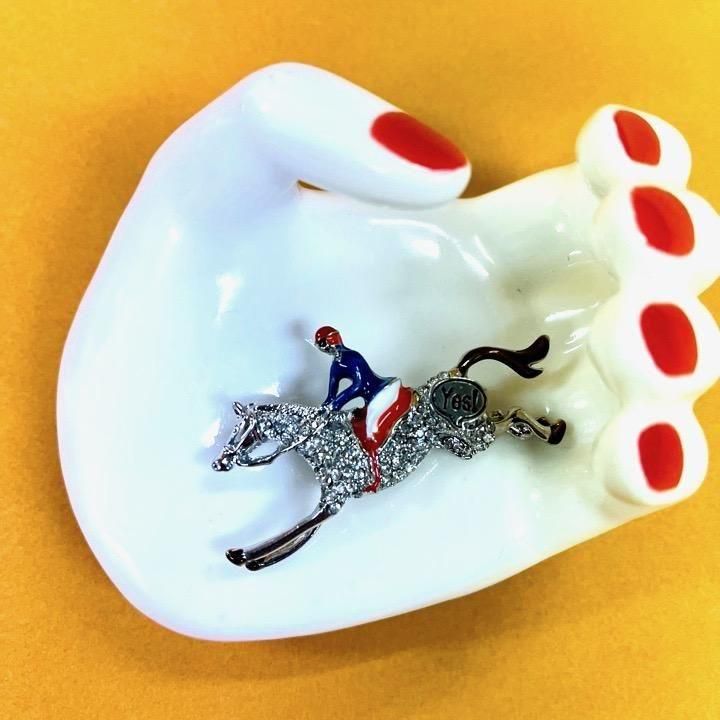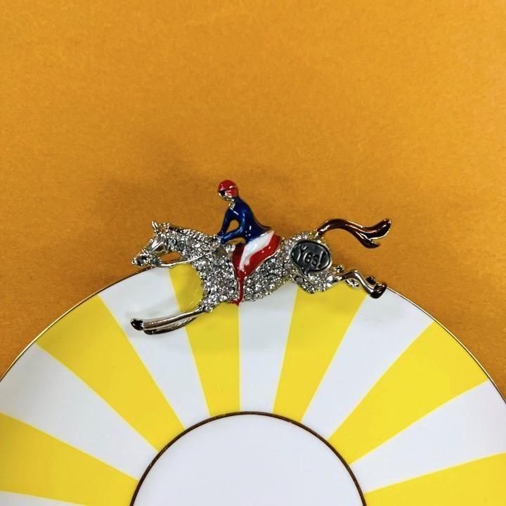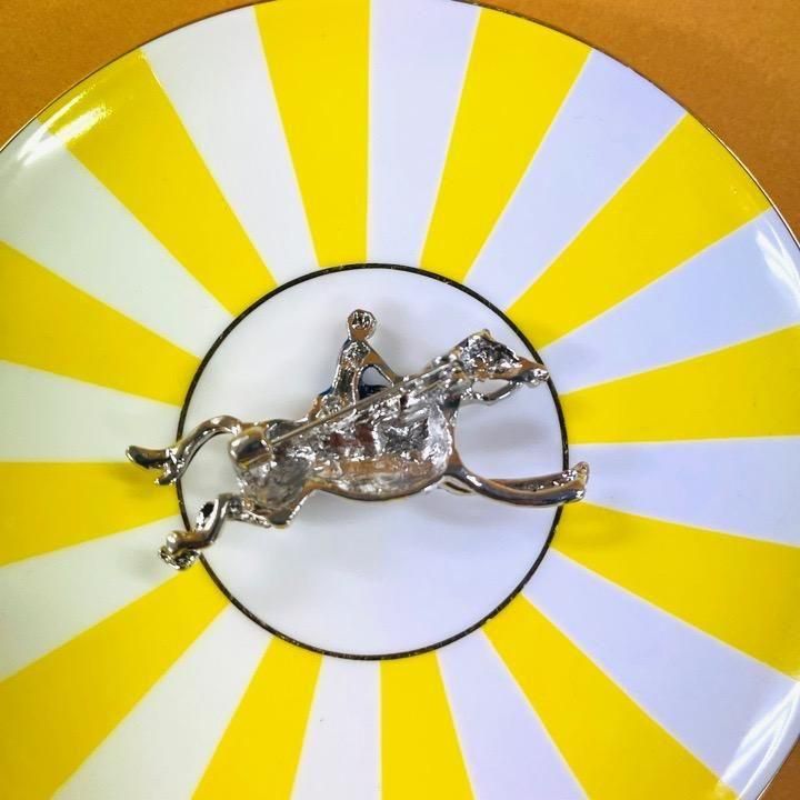 軽快に走り抜ける馬 優勝は目の前 輝く競馬レースブローチ